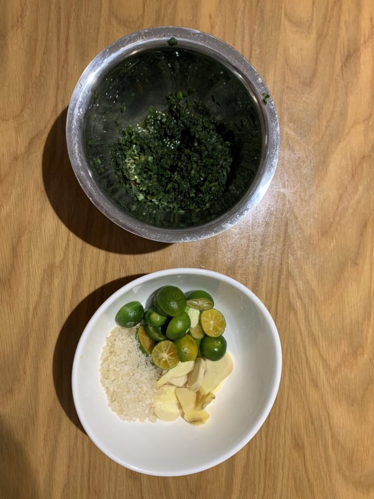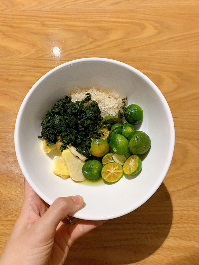 - Lá húng chanh: ngâm muối rửa sạch. Sau đó cắt và bầm nhỏ lá ra.