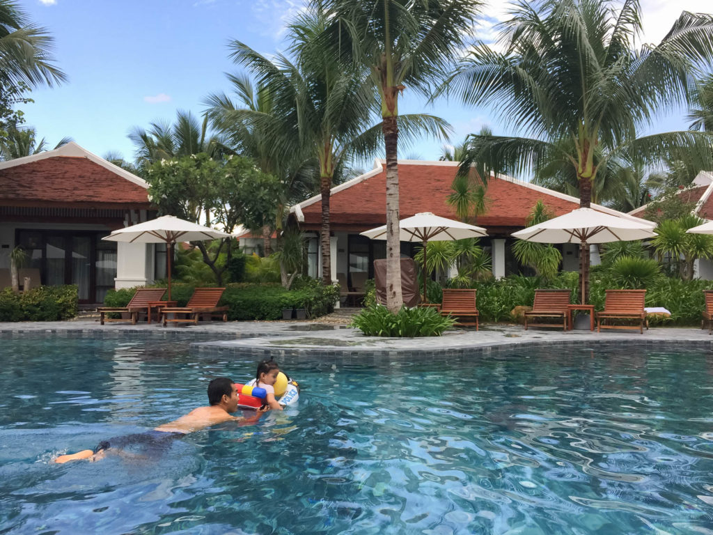 Anam có 3 hồ bơi lớn ở ba khu vực khác nhau. Hồ bơi lớn nhất là ngay trước cửa phòng mình haha vì phòng tụi mình đặt là “pool view”. Từ sảnh chính các bạn có thể nhìn thấy ngay một hồ bơi sâu 1m50 dành cho người lớn và một hồ bơi nhỏ kế bên aua 0.6m dành cho trẻ em.