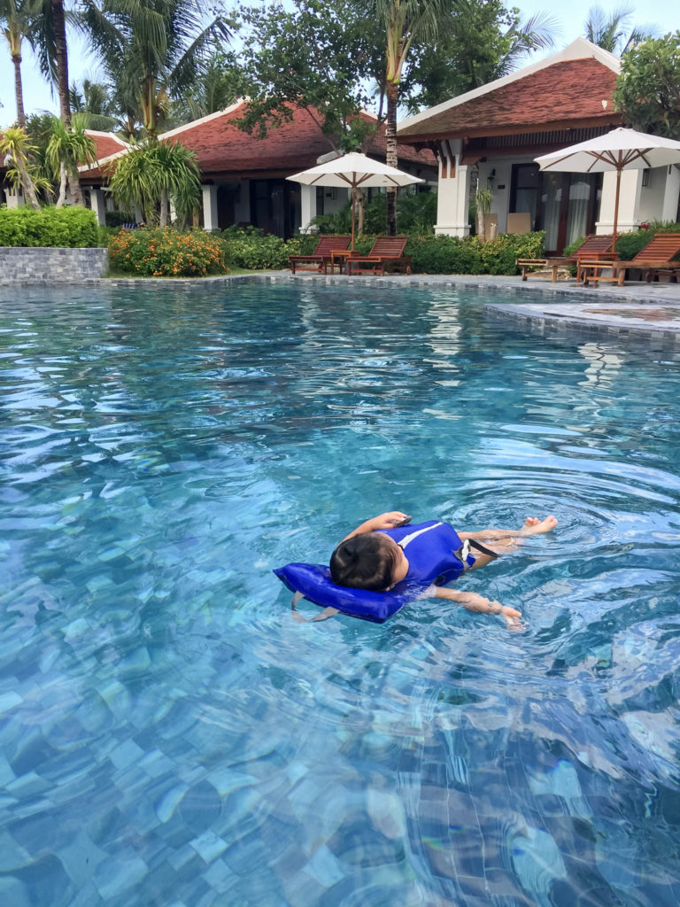 Ba Silk cố tình đặt phòng ngay vị trí này để Silk vừa mở toang cửa là chạy ra ngay hồ bơi mà chơi. Phải nói đây là quyết định hoàn toàn đúng đắn. Hồ nhỏ thì Silk đứng chân tới được nên chơi bóng nước, chơi trốn tìm cùng mẹ. Hồ lớn thì Silk bỏ xe phao police nằm thư giãn, rồi học bơi cùng ba mẹ. Nói chung quá ư là tiện, quá là sung sướng cho cả nhà.