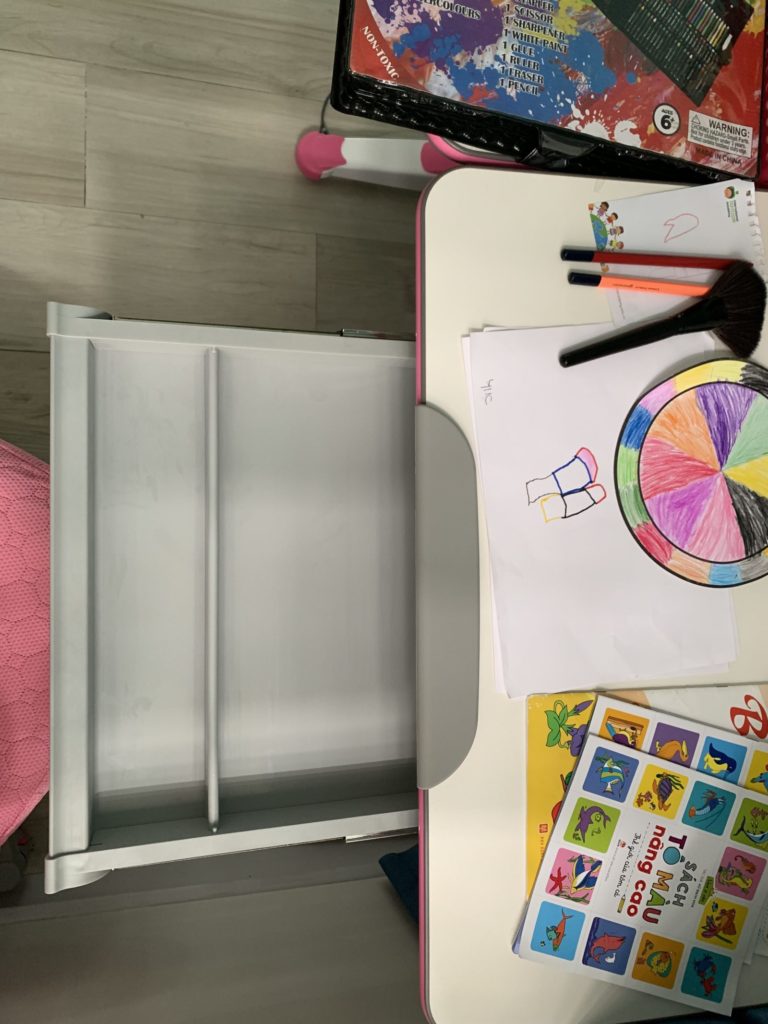 Còn bây giờ mình muốn chia sẻ với các bạn về bộ bàn ghế học thông minh chống gù – chống cận mà mình vừa tậu cho Silk vì khá ưng ý. Khi nhìn con nằm dài rồi ngồi còm lưng tô màu, mình nhận ra đã đến lúc Silk cần một bộ bàn ghế học nghiêm túc – đánh dấu giai đoạn trưởng thành mới của cô ấy.