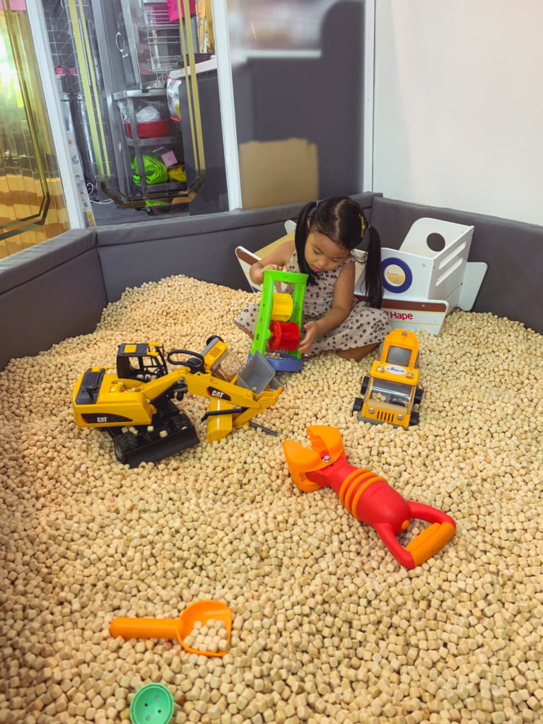Dù mang tên là cafe trẻ em nhưng không gian bên trong của Lilliput lại to lớn, thoáng đãng, được phân chia đa dạng góc chơi khác nhau phục vụ theo nhiều sở thích cũng như giới tính của các bé. Không chỉ riêng Silk mà ngay cả mình còn phải lúng túng vì không biết nên bắt đầu chơi từ đâu haha do góc chơi nào cũng đẹp từ góc làm đẹp, góc nhà banh, góc chơi cát, góc làm bếp, góc thiết kế, vòng xoay ngựa gỗ, mô hình đường đua bằng gỗ, ngôi nhà búp bê xinh xắn, lều cắm trại, bộ dụng cụ DIY… đem đến cho bé những trải nghiệm thú vị, kích thích sự tư duy và trí tưởng tượng tối đa.