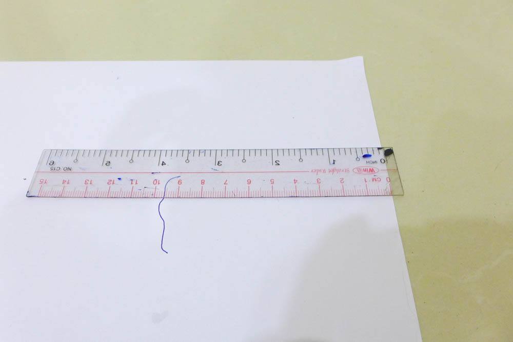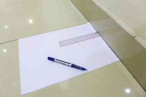 Dán tờ giấy trắng xuống sàn nhà, một cạnh đặt sát mép tường. Bạn cho bé đứng lên trên tờ giấy, thẳng người, gót chân tựa vào tường.