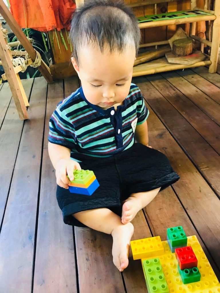 Ngày đầu tiên, ừ 8g-9g sáng mình ngồi chơi thoải mái cùng Quinn trong lớp cùng với cô và các bạn nhỏ. Ban đầu Quinn hơi e dè, ngồi sát trong lòng mình, tò mò quan sát mọi người và cảnh vật xung quanh. Khi thấy đồ chơi mới, em thích thú chạy lại tóm lấy rồi vội vàng quay lại tìm mẹ. Các cô tích cực dần dần làm quen trò chuyện cùng Quinn nhẹ nhàng.