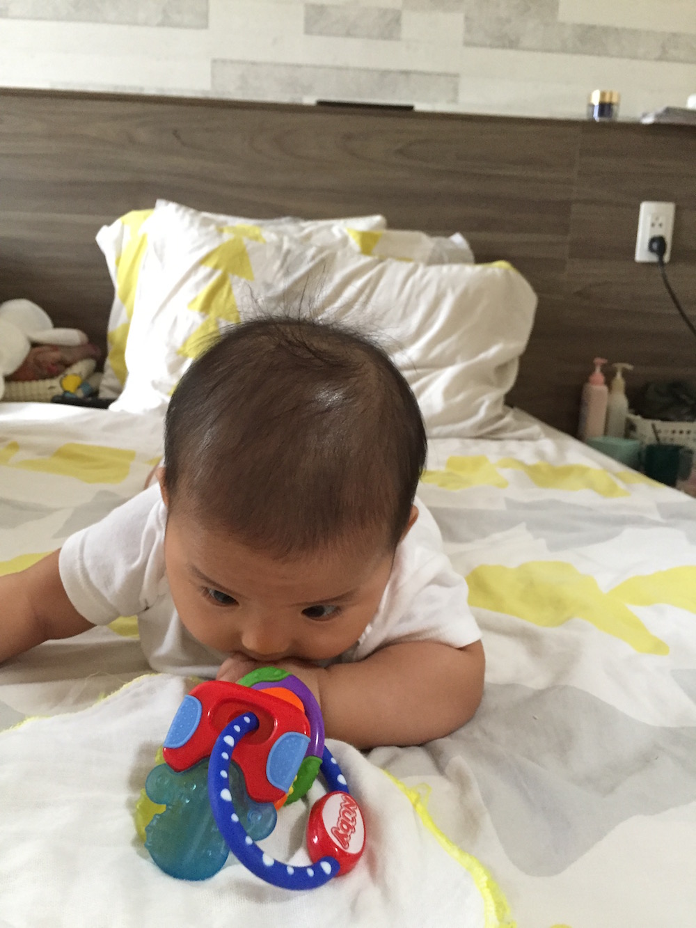 Cứ sau khi Silk bú xong, mình rửa cục gặm sạch sẽ rồi đưa con ngậm. Bả nằm chơi với tay rồi gậm gậm thích thú cả buổi trời. Vừa giúp bé luyện tay, vừa giảm bú tay lại vừa tập bé tự chơi! Đặc biệt mỗi khi Silk quấy khóc, mình chỉ cần giơ giơ chìa khoá là toe toét lại. Quá nhiều công dụng bổ ích các mẹ nhé! Đến bây giờ Silk đã được 7 tháng nhưng vẫn còn đam mê với “chiếc chìa khoá thần kì”.